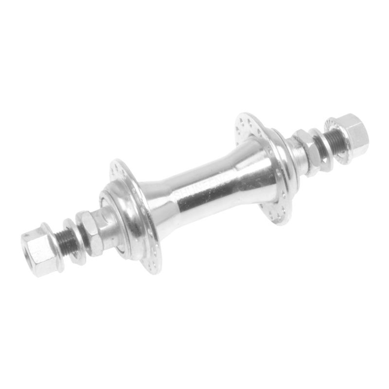 Přední ocelový náboj s 28 dírami pro špice - paprsky. Náboj s lesklým chromovaným povrchem má šířku do vidlice 92 mm.