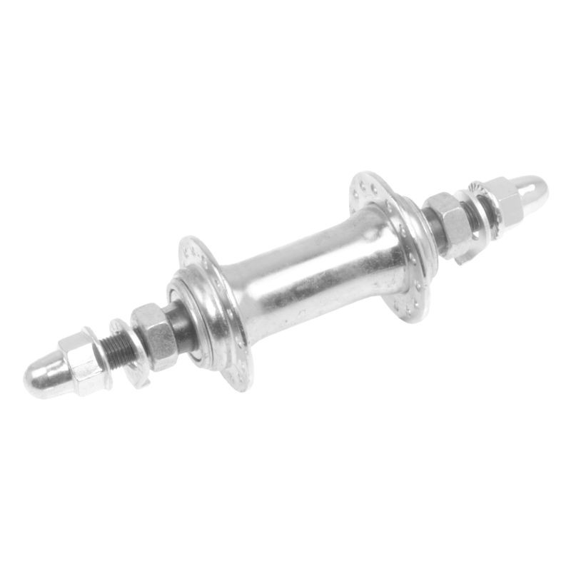 Ocelový náboj pro přední kolo, s výpletem na 28 paprsků (drátů). Kompletní přední chromovaný náboj s podložkami a maticemi.