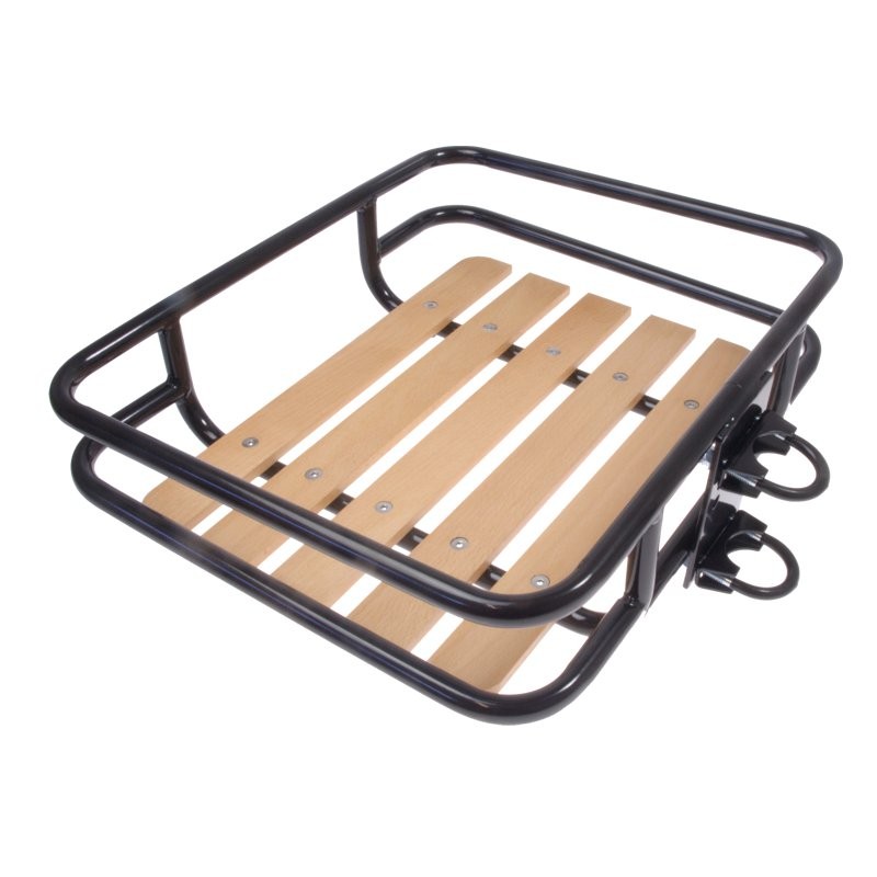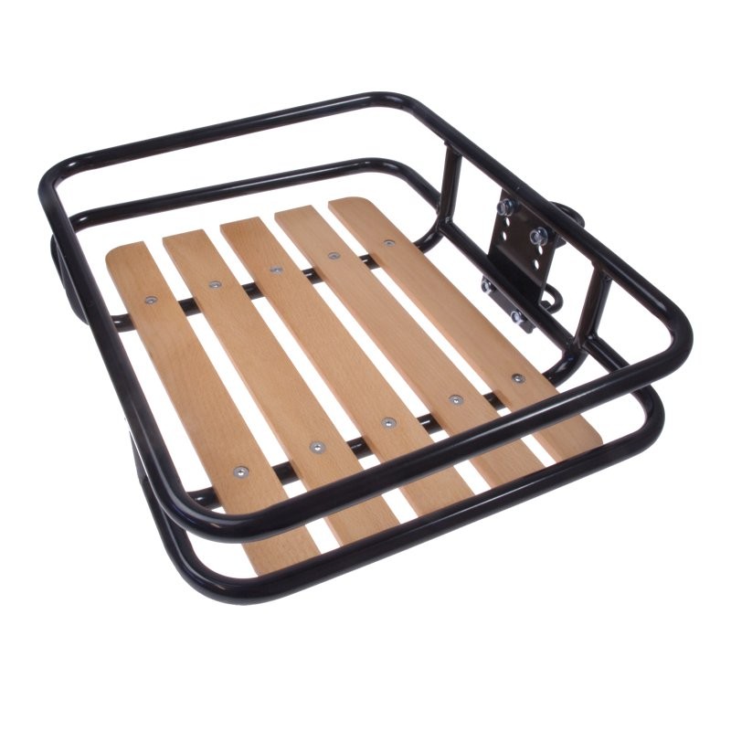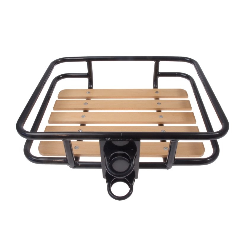 Jedinečný přední ocelový nosič s dřevěnou ložnou plochou. Ideální a stylový doplněk pro městská, retro a cargo jízdní kola.