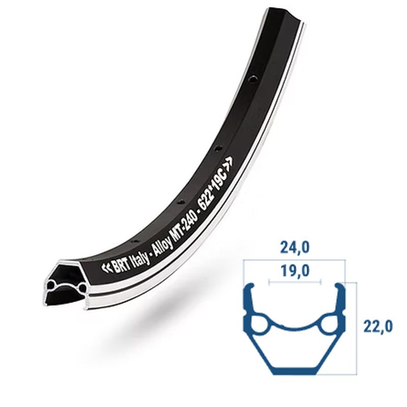 Zesílený dvoustěnný 20" ráfek Beretta MT-240 černé barvy s 28 dírami pro dráty (špice) s CNC opracováním boků pro lepší brzdnou účinnost.