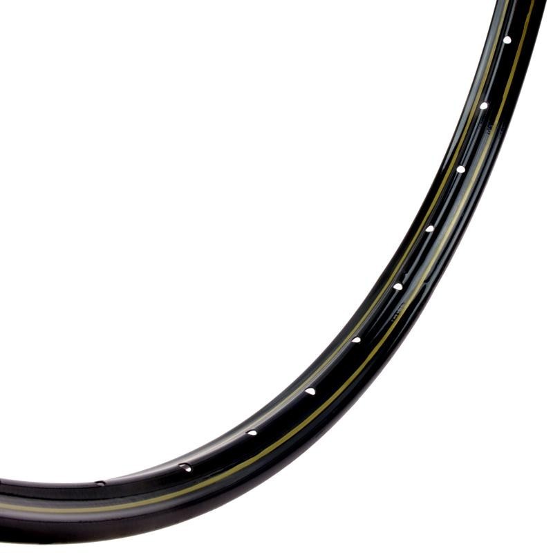 Klasický hliníkový ráfek černé barvy je doplněn 2 zlatými linkami - ideální pro renovaci historických nebo starších městských jízdních kol. Starodávný profil ráfku neumožňuje použítí klasické čelisťové brzdy. Ráfky jsou ideální v kombinaci s ocelovými blatníky černé barvy se zlatou linkou.