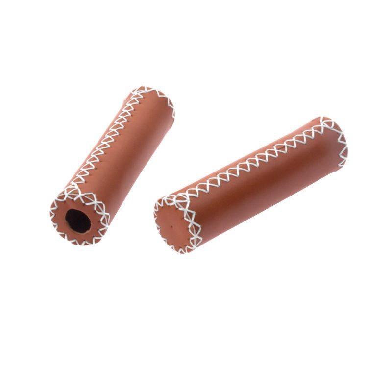 Pravé kožené rukojeti (gripy) hnědé barvy s obšitím bílou nití.