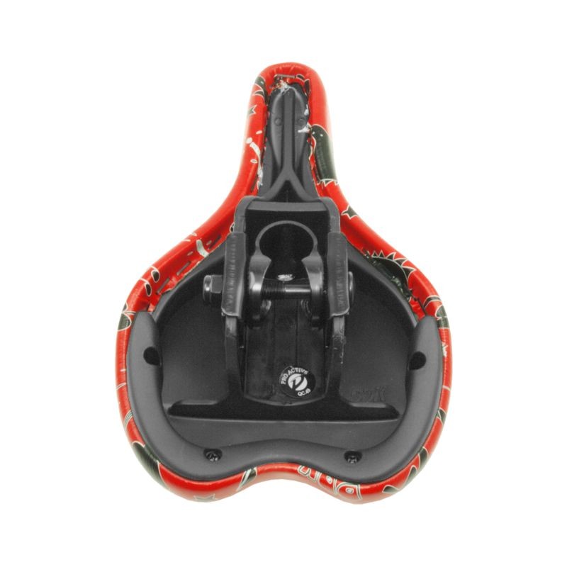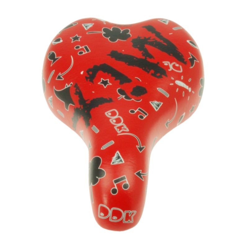 Malé sedlo DDK určené pro dětská jízdní kola nebo odrážedla. Barva sedla červená s černou grafikou.