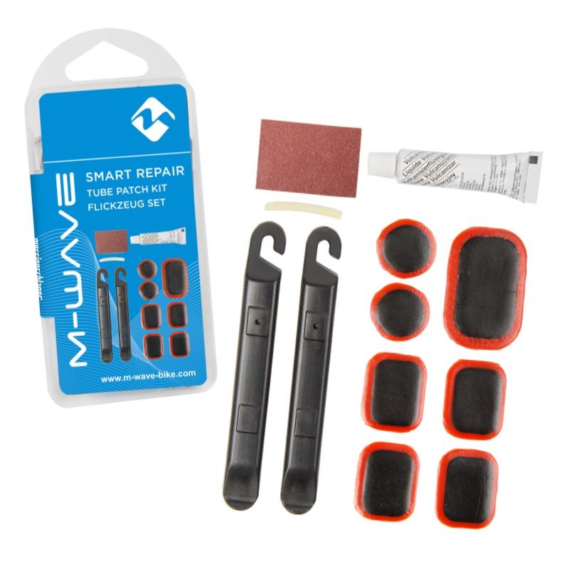 Sada záplat a plastových montpák pro demontáž pláště z ráfku jízdního kola při lepení duše. Vše potřebné je uloženo v praktické kompaktní plastové krabičce, která se snadno vejde do batohu nebo brašny na kole.