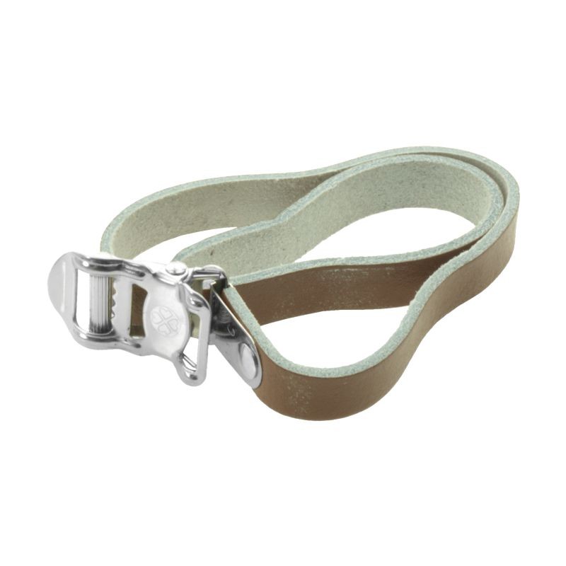 Univerzální kožený řemínek s rychloupínací přezkou určený pro pedálové klipsny nebo např. pro upevnění proutěného koše na kolo.