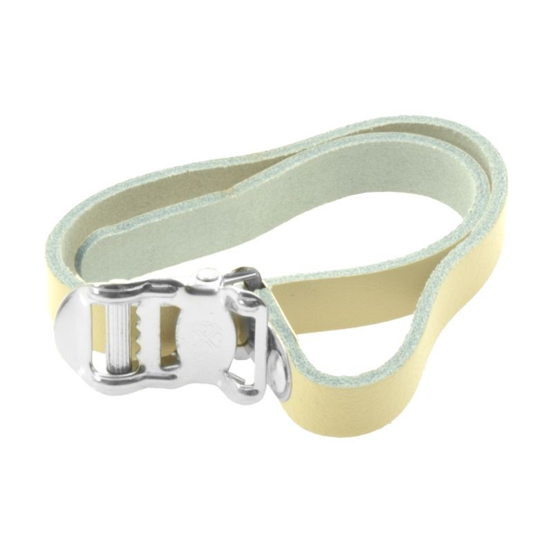 Kožený řemínek světle krémové barvy se stříbrnou stahovací přezkou vhodný nejen na klipsny pedálů.